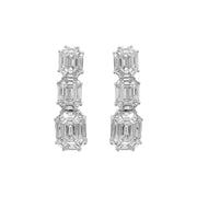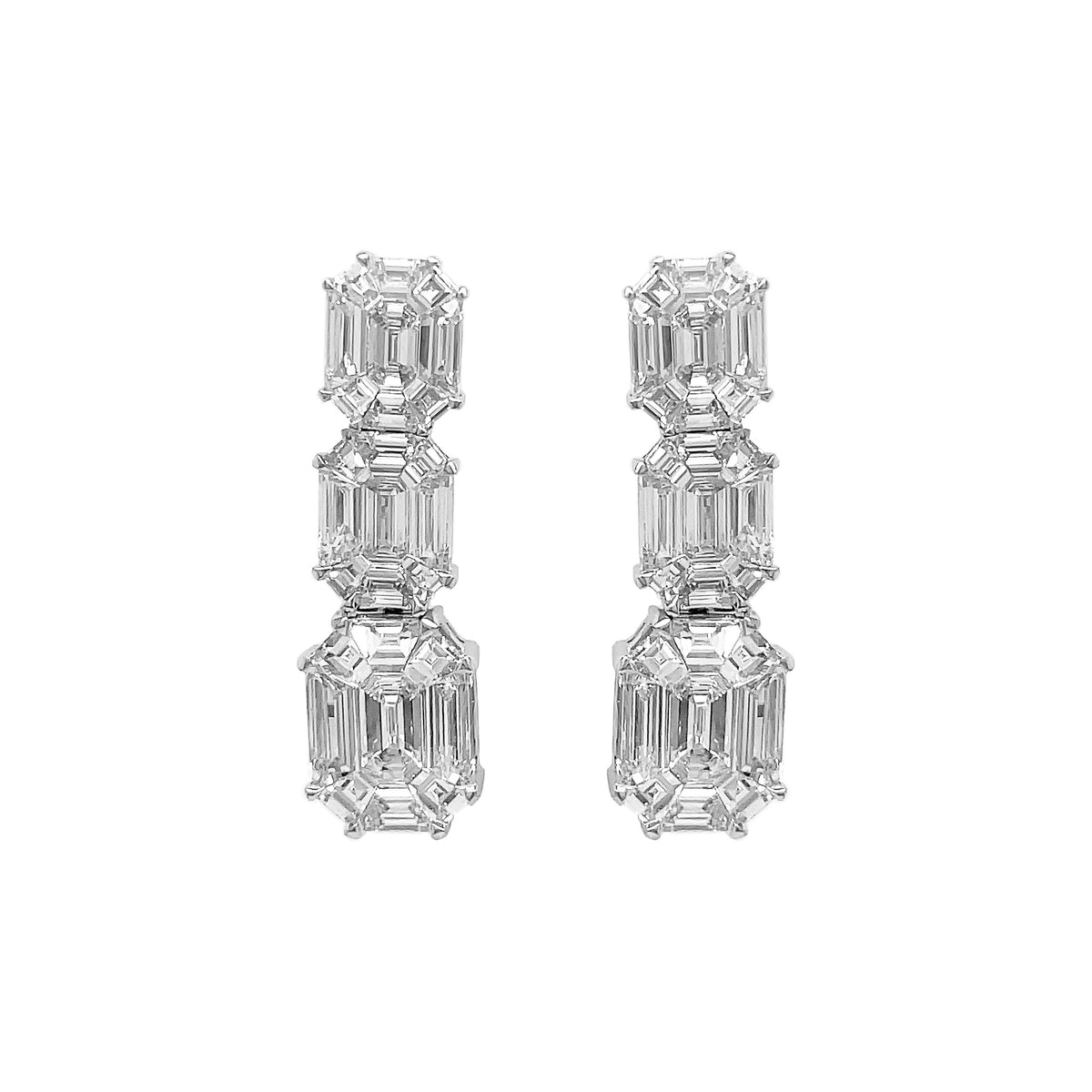 18kt white gold invisible set emerald cut diamond illusion multi-cluster dangling earrings.