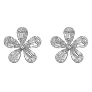 18kt white gold micro prong set baguette and round brilliant diamond flower earrings.