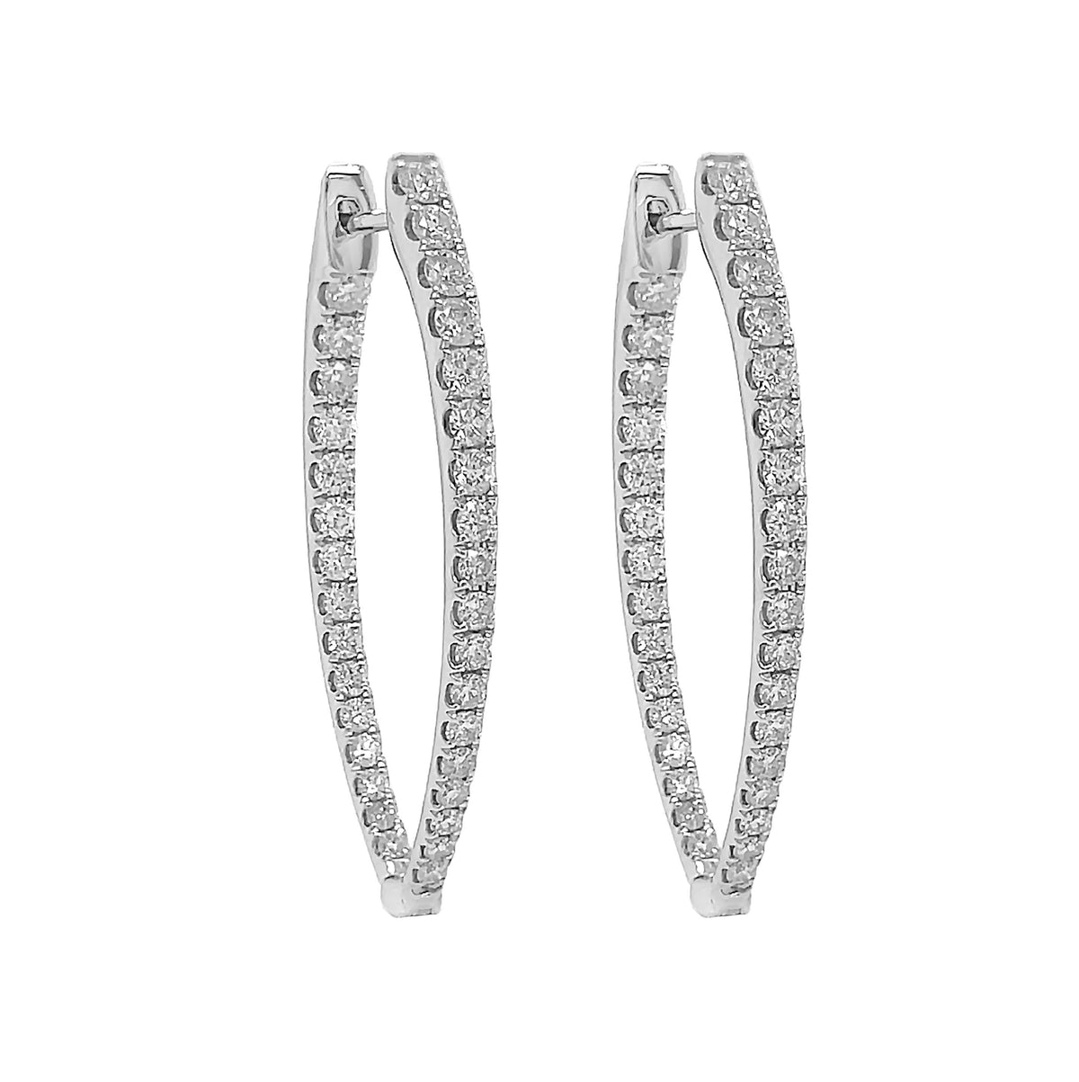 18kt white gold micro prong set round brilliant diamond elongated v shaped inside-out hoops.