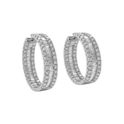 18kt white gold channel set baguette and micro prong set round brilliant diamond inside-out round hoops.