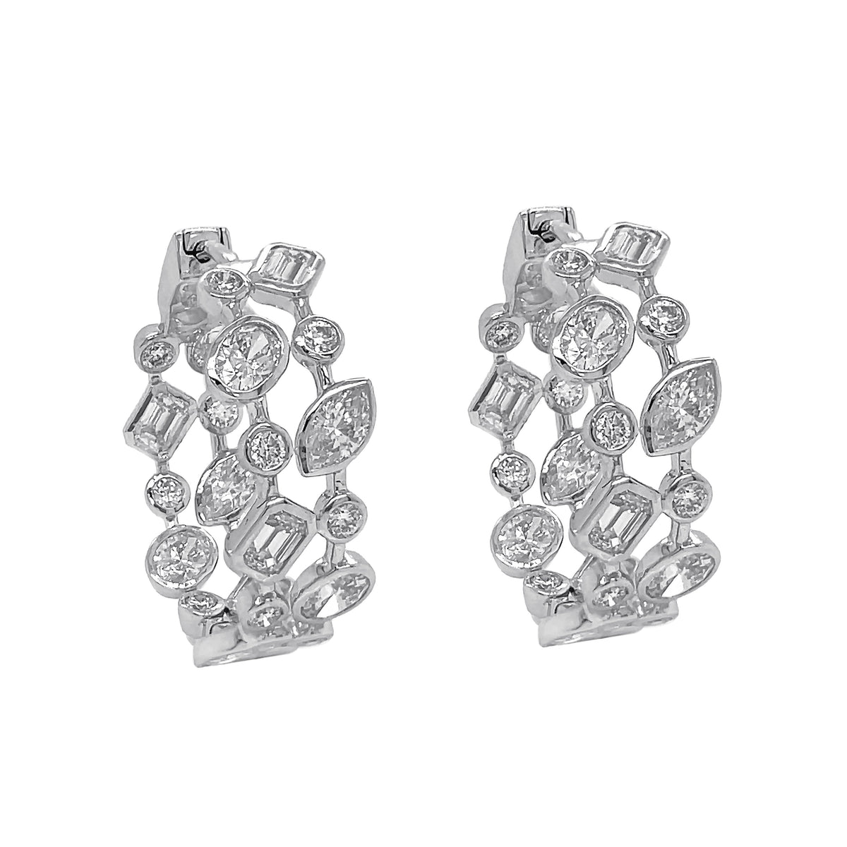 18kt white gold bezel set marquise, oval, emerald and round brilliant diamond 2-row inside-out hoops.