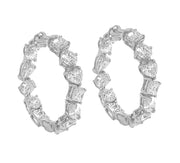 18kt white gold prong set marquise, princess, pear, emerald, heart, oval and round brilliant diamond hoop earrings.
