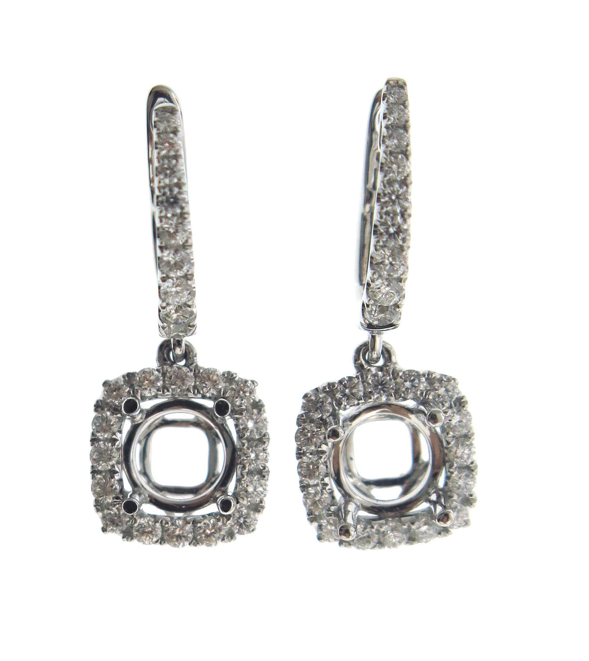18kt white gold micro prong set round brilliant diamond dangling earring mounting with cushion halo