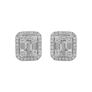 18kt white gold channel set baguette and prong set round brilliant diamond emerald shaped cluster studs with halo.