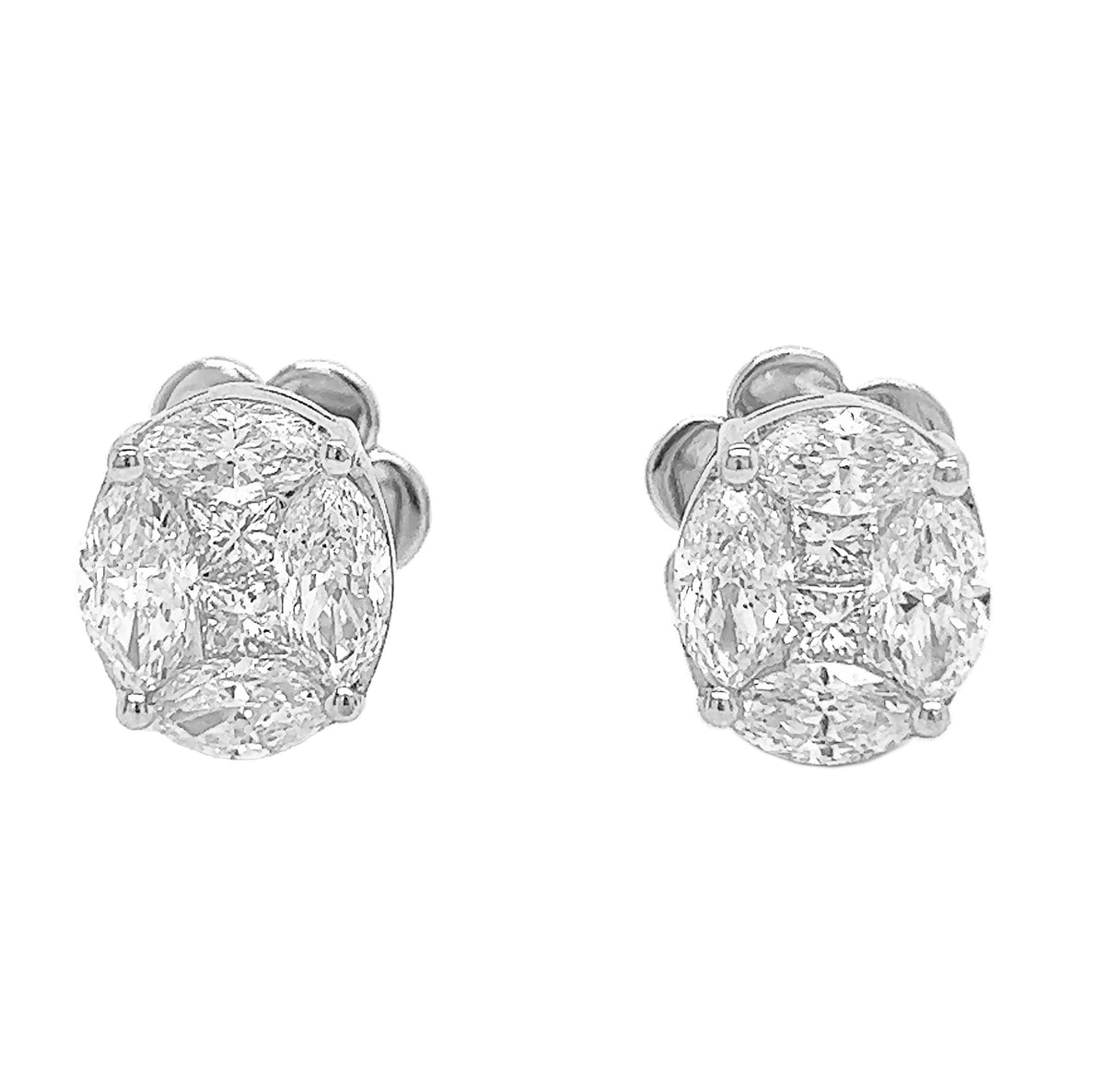 18kt white gold invisible set marquise and princess cut diamond oval cluster stud earrings.