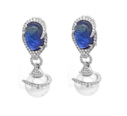 18kt white gold micro prong set round brilliant diamond, tanzanite and south sea pearl dangling earrings. Diamond weight: 1.12ctw South Sea Pearl: 13mm