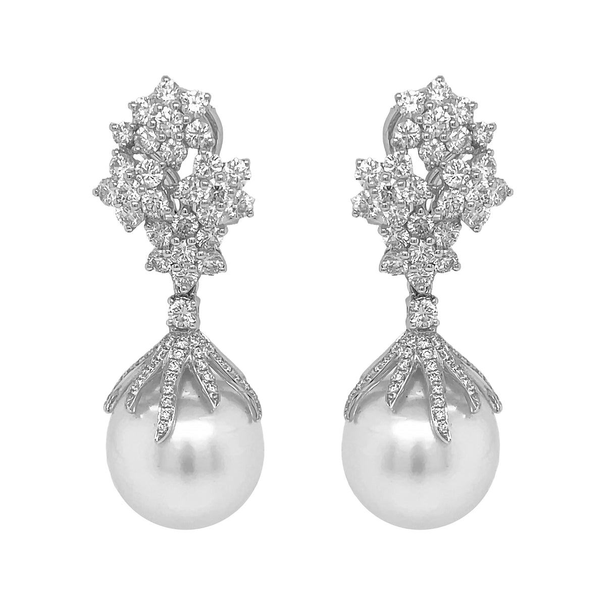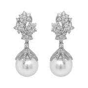 18kt white gold micro prong set round brilliant diamond 4 flower cluster earrings with removable dangling south sea pearl. round diamonds = 2.50ctw South sea pearl = 14-14.2mm