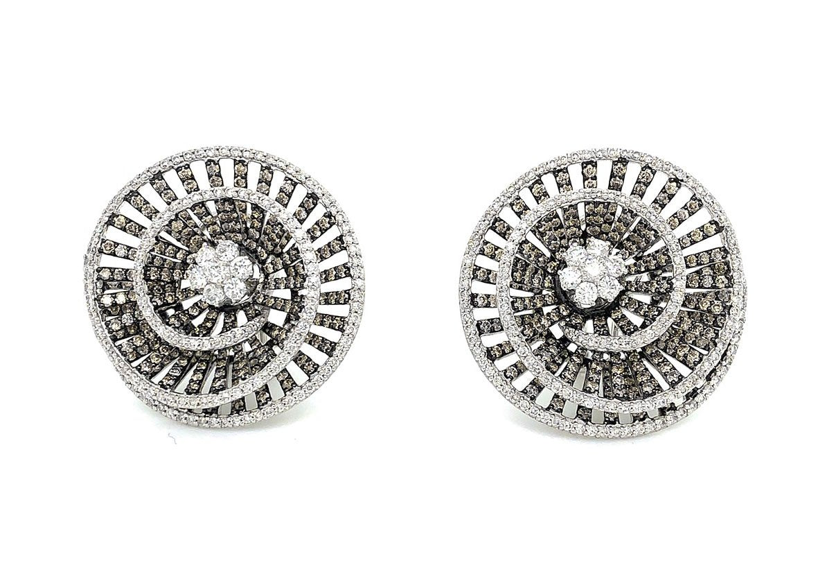 18kt White gold mutual prong and pave set Cognac and White Round Brilliant Diamond spiral earrings with a cluster of round diamonds in center 560 Cognac Diamonds = 3.37ctw 298 Diamonds = 1.93ctw