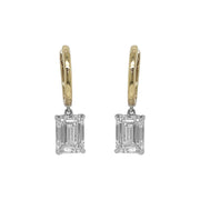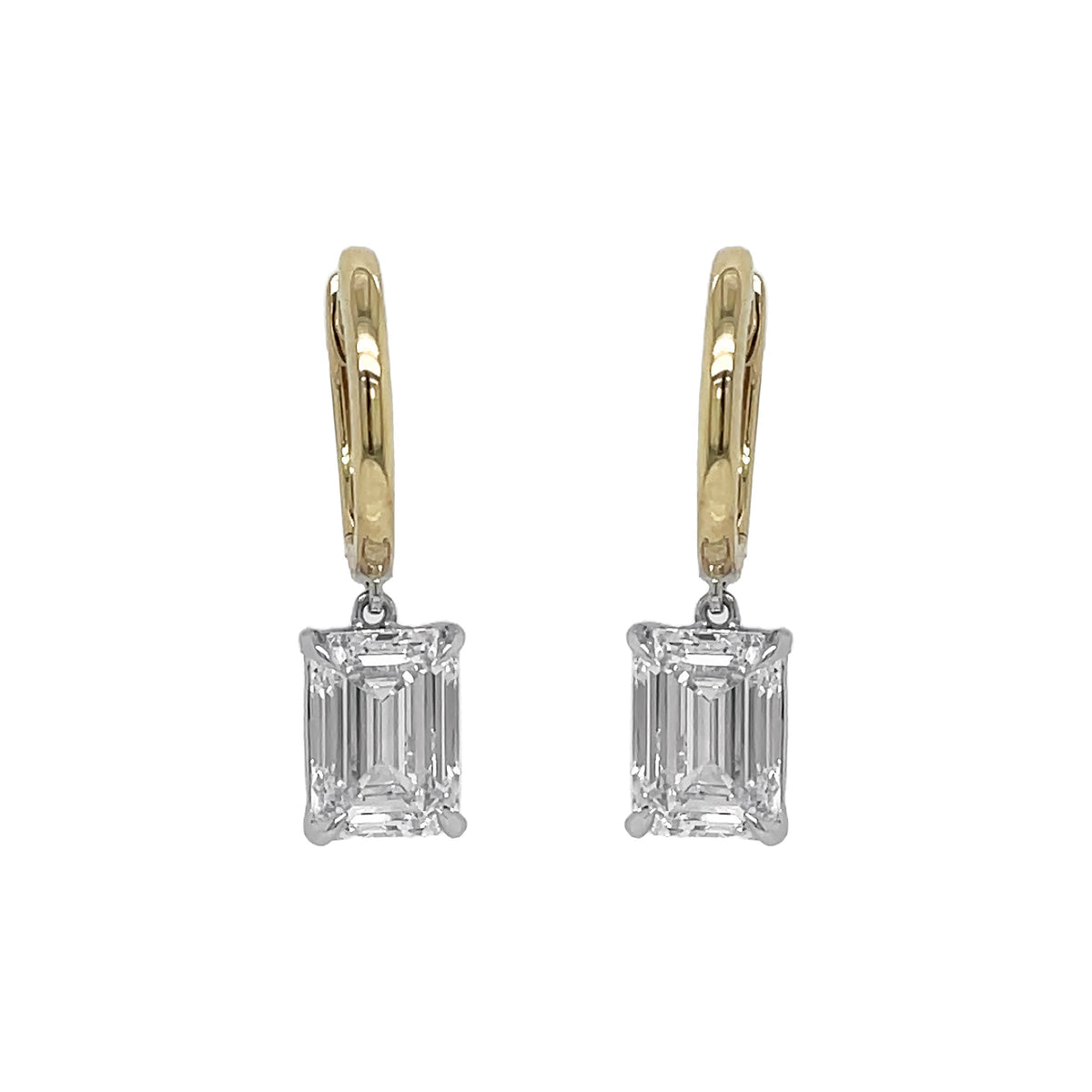 18kt yellow and white gold 4 prong set IGI certified laboratory grown emerald cut diamond dangling earrings.