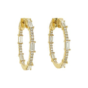 18kt yellow gold 4 prong set baguette and micro prong set round brilliant diamond hoop earrings.