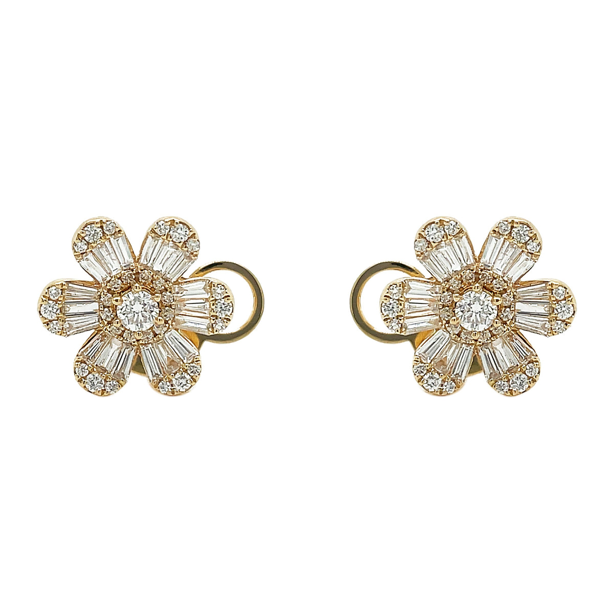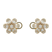 18kt yellow gold micro prong set baguette and round brilliant diamond flower earrings.