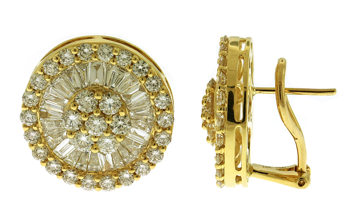 18kt yellow gold mutual and prong set round brilliant diamond with channel set baguette diamond pizza earrings with lever back