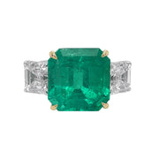 18kt white gold 4 prong set GIA certified green emerald and square emerald cut diamond 3-stone ring. Stone 1: GIA certificate No.: 2233699634 Weight: 10.83carat Cut: Octagonal Step Cut Origin: Colombia