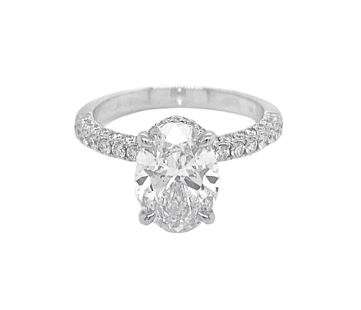 18kt white gold 4 prong set GCAL Certified Lab Grown Oval Diamond ring with micro prong set round brilliant diamond 3-D shank.