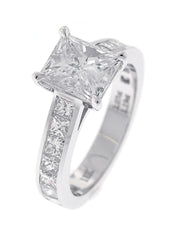 18kt white gold channel set princess cut diamond and prong set clarity enhanced princess cut diamond set into center.