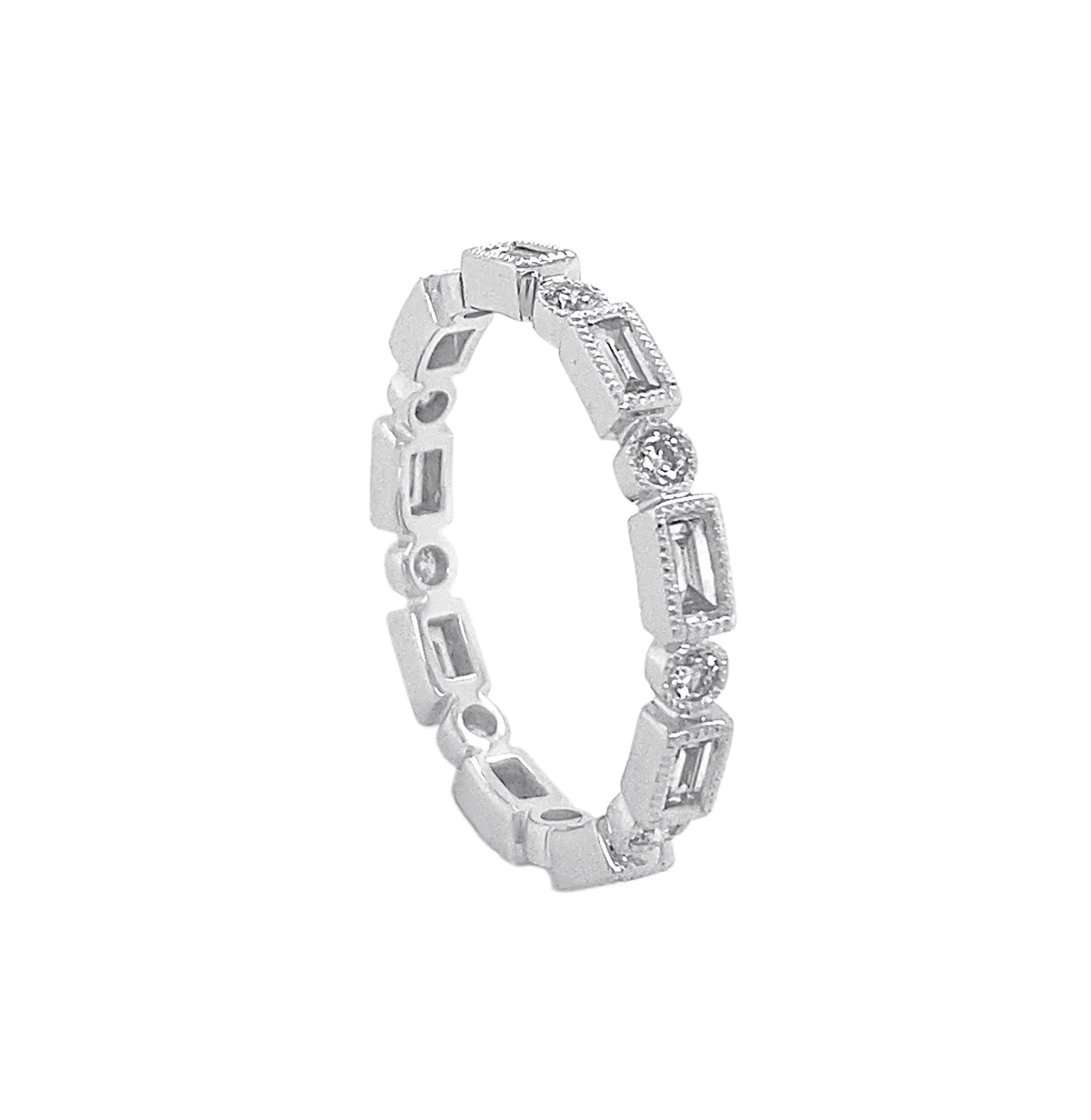 18kt white gold alternating bezel set baguette and round brilliant diamond eternity band with milgrain finish.