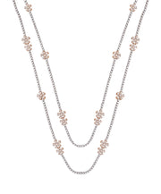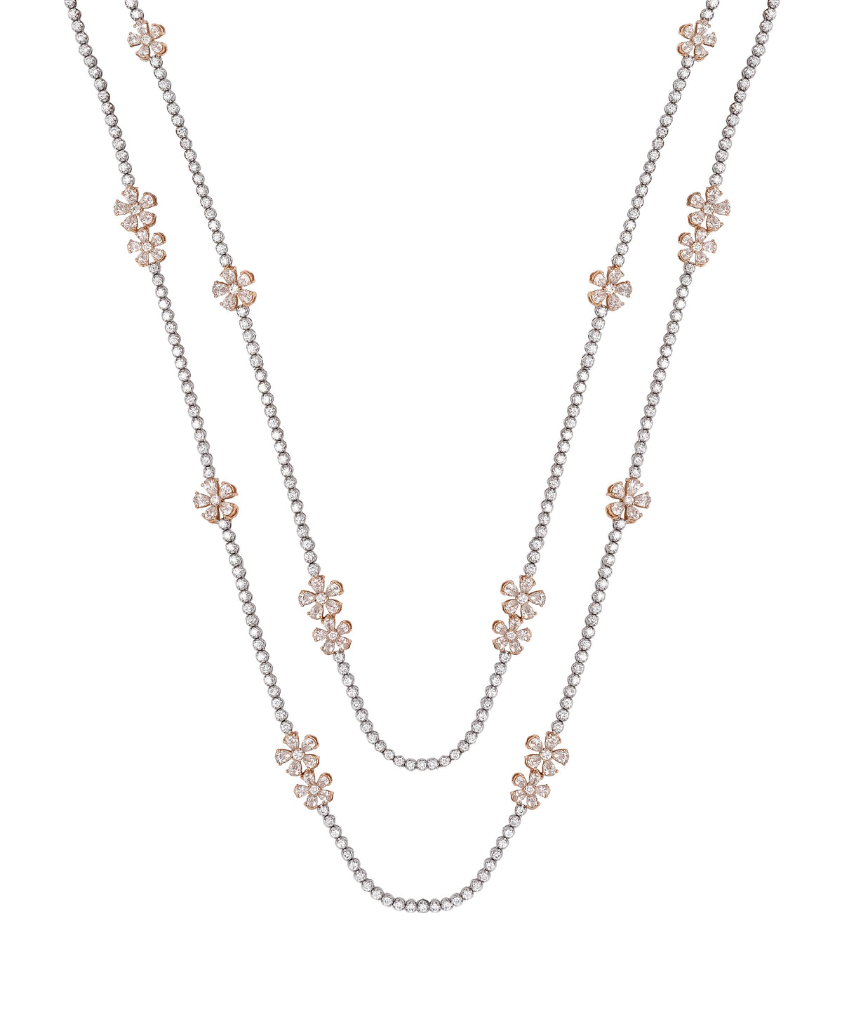 18kt white and rose gold prong set pear and round brilliant diamond 2-row multi-cluster long necklace.