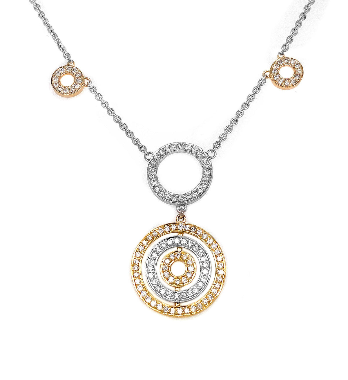 18kt white and yellow gold micro pave set round brilliant diamond 3 round open disk necklace 49 round diamonds = 0.41ctw 76 round diamonds = 0.64ctw 16-17" long