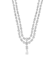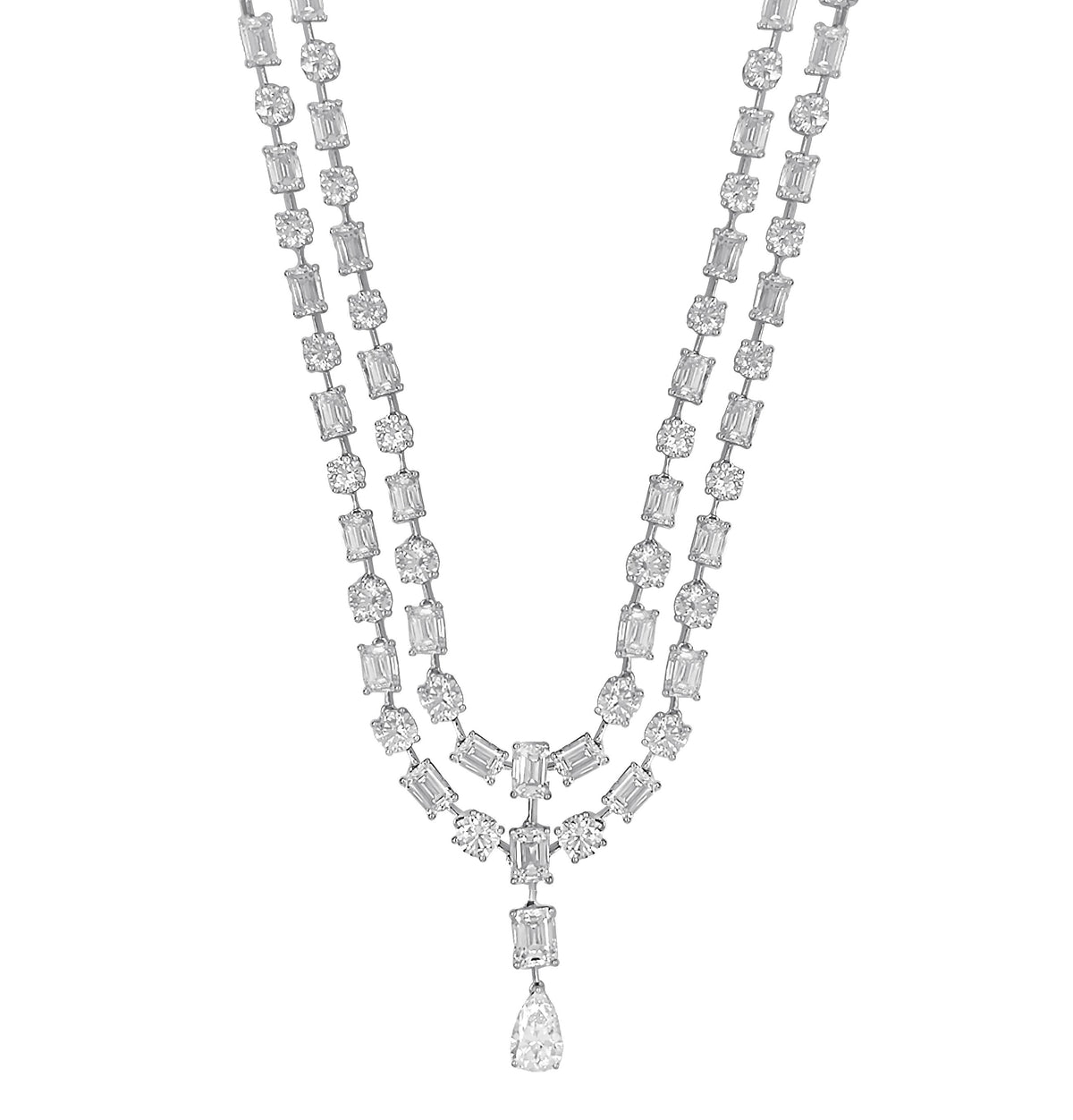 18kt white gold 4 prong set GIA certified emerald and round brilliant diamond 2-row necklace.