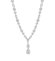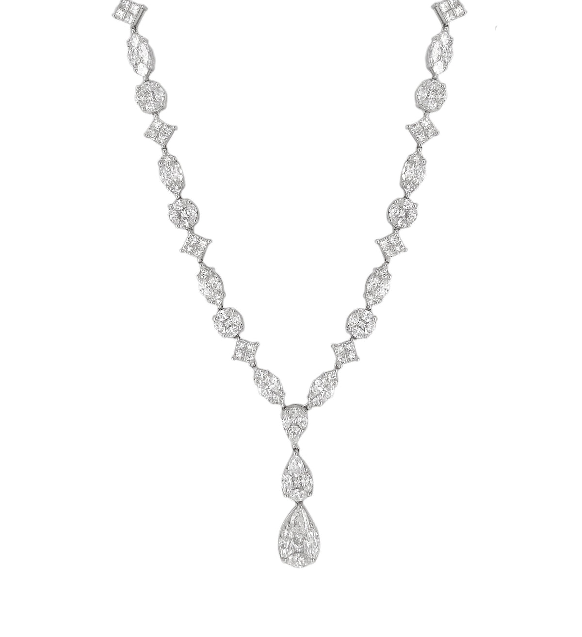 18kt white gold invisible set marquise, princess, and pear shaped diamond multi-cluster dangling necklace.