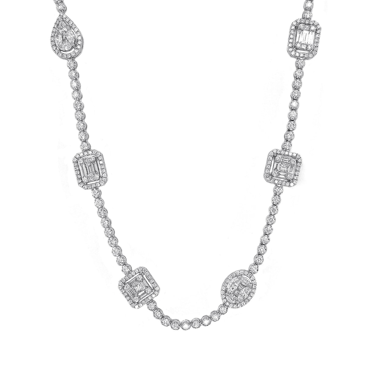 18kt white gold prong and invisible set marquise, pear, princess, baguette and round brilliant diamond multi-cluster necklace.