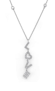 18kt white gold micro prong set round brilliant diamond dangling 'love' necklace with diamonds-by-the-inch chain.