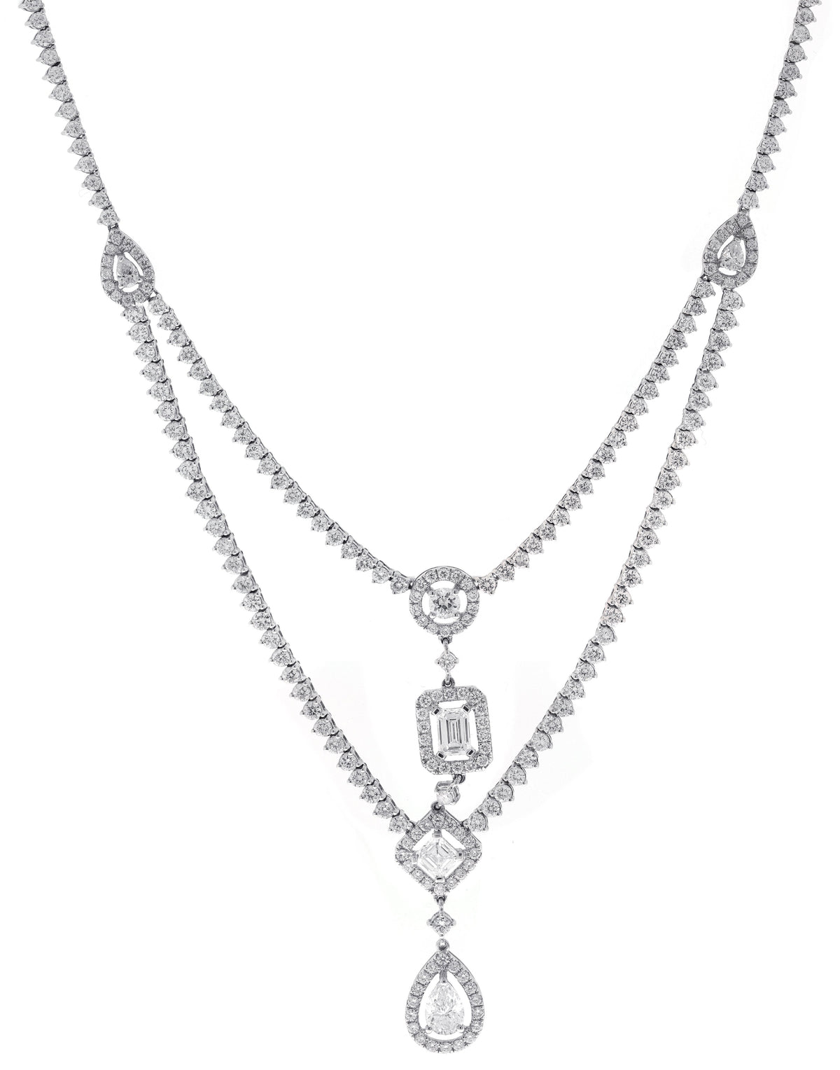 18kt White gold mutual prong set round brilliant diamonds with baguettes and pear shape diamond necklace \