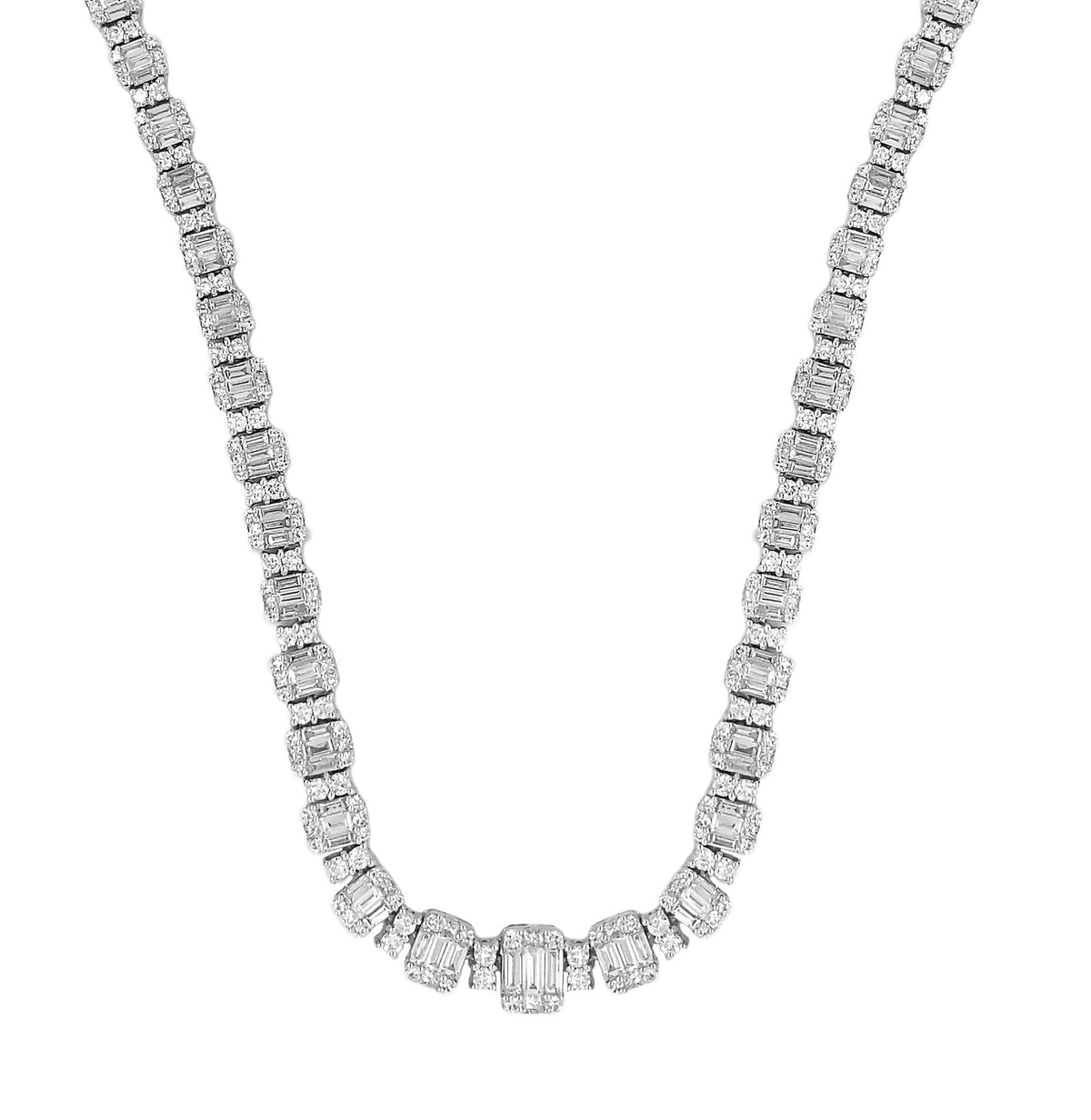 18kt white gold channel set baguette and round brilliant diamond multi-cluster tennis necklace.
