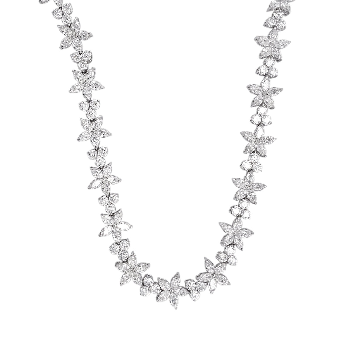 18kt white gold prong set marquise and round brilliant diamond multi-cluster flower necklace.