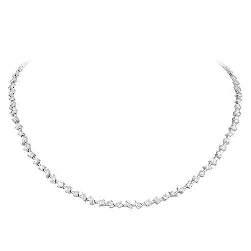 18kt white gold prong set pear, oval, marquise, baguette and round brilliant diamond tennis necklace.