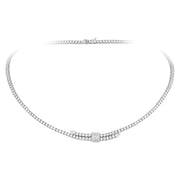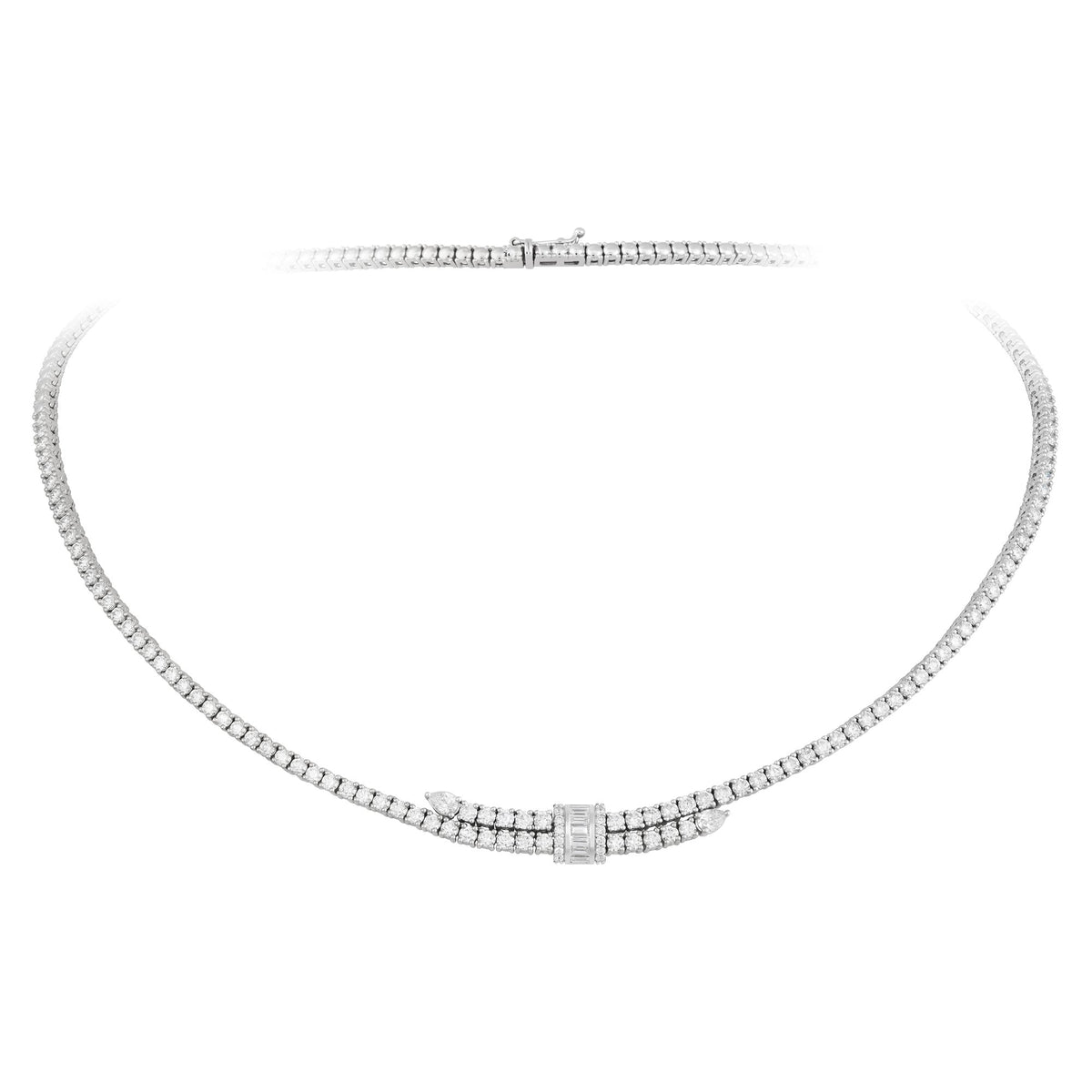 18kt white gold channel set baguette, prong set pear and round brilliant diamond tennis necklace.