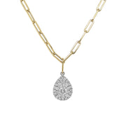 18kt yellow and white gold micro prong set round brilliant diamond pear shaped cluster necklace with paper-clip chain.