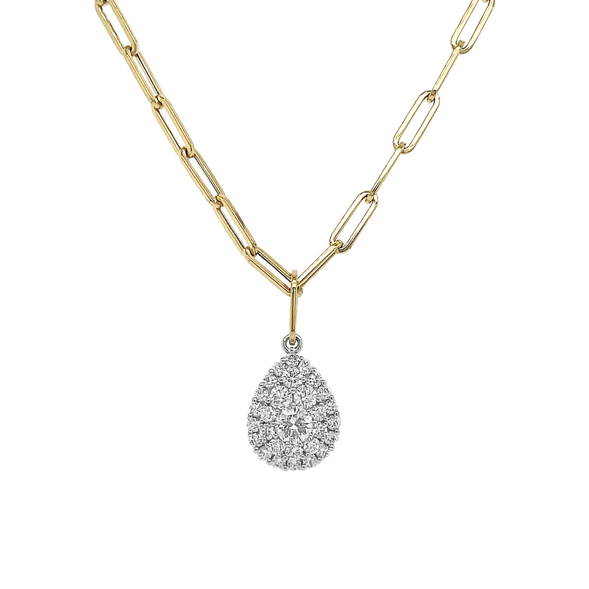 18kt yellow gold micro prong set round brilliant diamond pear shaped cluster necklace with paper-clip chain.