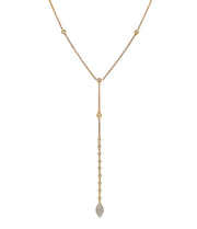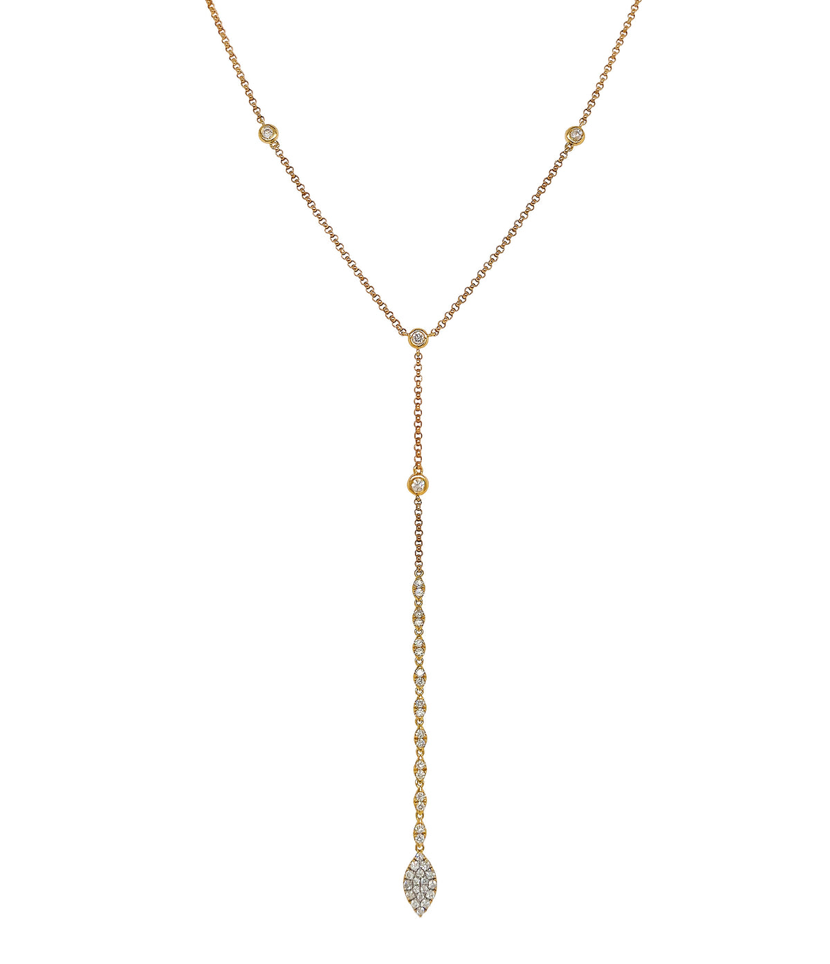 18kt yellow gold micro prong and bezel set round brilliant diamond, dangling diamonds-by-the-inch necklace.