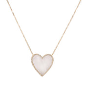 14kt yellow gold micro prong set round brilliant diamond and white mother of pearl heart pendant.