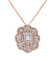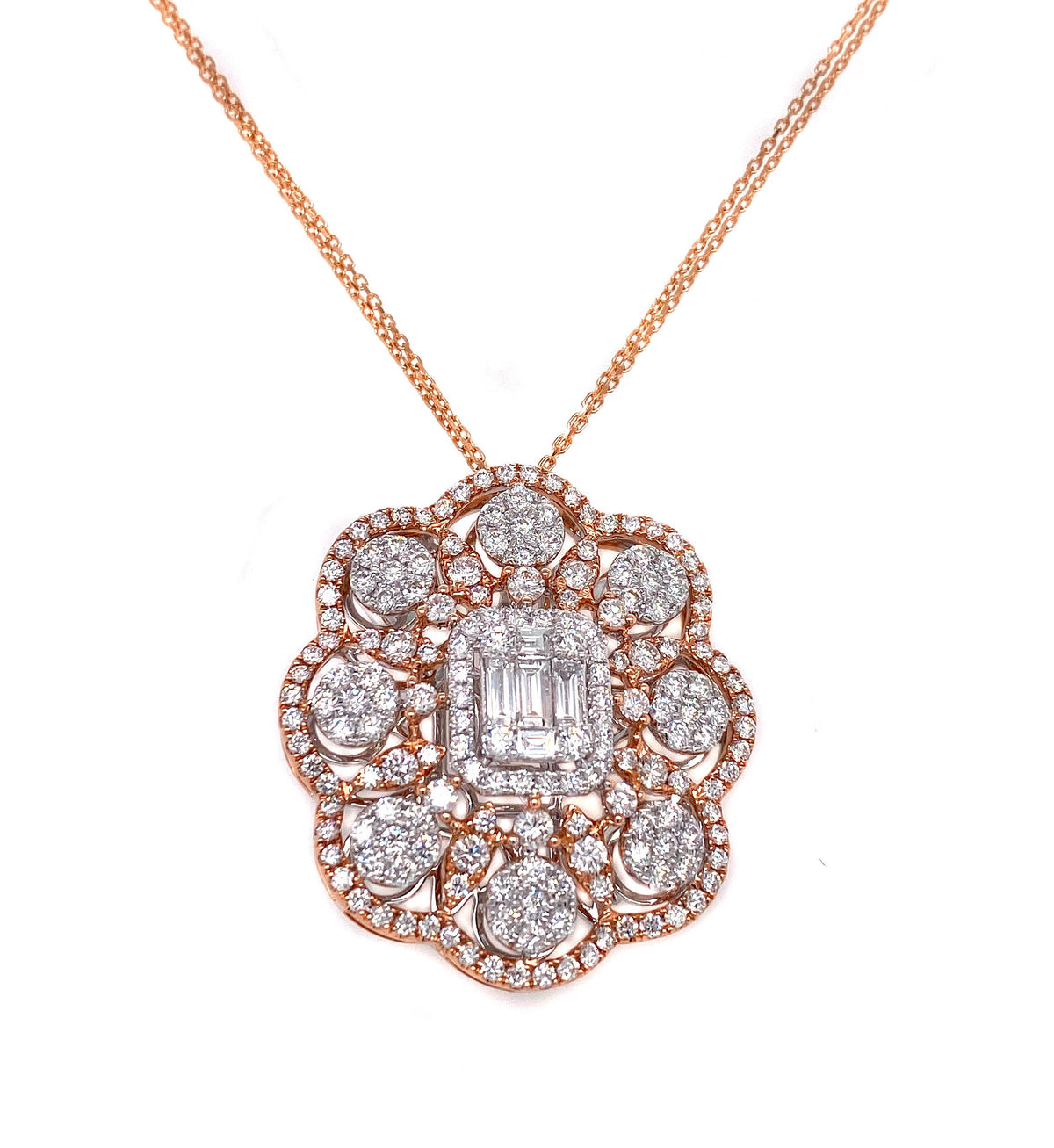 18kt rose and white gold micro prong set round brilliant diamond and channel set baguette diamond flower pendant (convertable to pins).