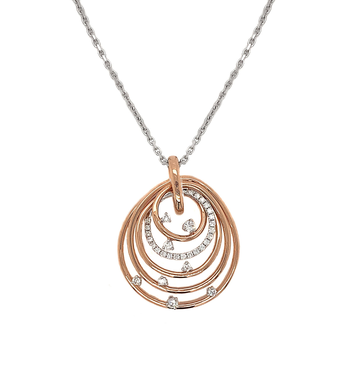 18kt rose and white gold micro prong and prong set round brilliant diamond spiral design pendant.