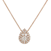 18kt rose gold micro prong set round brilliant diamond pear shaped cluster pendant.