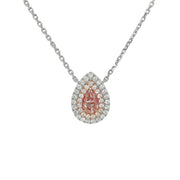 18kt white and rose gold 3 prong set pear shaped pink diamond pendant with micro prong set round brilliant diamond double halo. 1 pink diamond = 0.70ctw 40 round diamonds = 0.44ctw