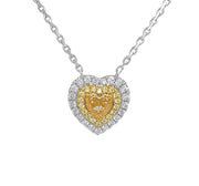 18kt white and yellow gold 3 prong set heart shaped yellow diamond pendant with micro prong set round brilliant diamond double halo.