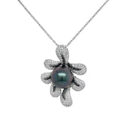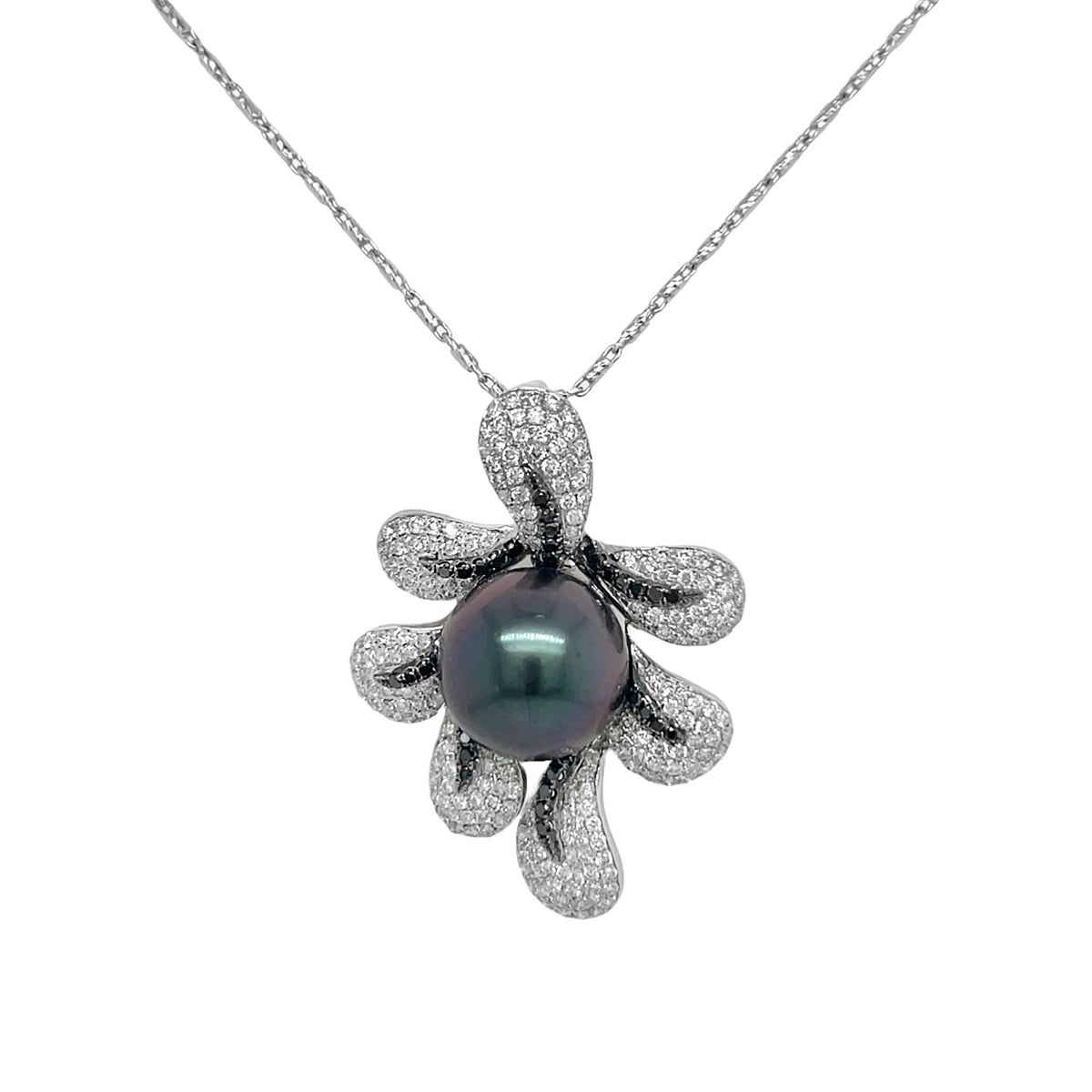 18kt White gold micro pave set black and white round brilliant diamond with a tahitian pearl set into center Pendant with an enhancer free form 34-Black diamonds=0.29ctw 209-Diamonds=1.79ctw