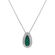18kt white gold 3 prong set green emerald pendant with prong set pear and round brilliant diamond halo. 1 emerald = 7.13ctw 19 pear diamonds = 2.94ctw 19 round diamonds = 0.33ctw