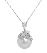 18kt white gold micro pave and invisible set marquise, princess and round brilliant diamond, south sea pearl pendant with 14kt white gold cable link chain.