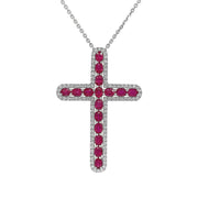 18kt white gold mutual prong set oval shaped ruby and micro prong set round brilliant diamond cross pendant with 14kt white gold cable link chain. 16 rubies= 3.10ctw 96 round diamonds= 0.85ctw
