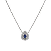 18kt white gold 3 prong set blue sapphire and prong set baguette and round brilliant diamond tear drop pendant. 1 blue sapphire = 0.41ctw 20 round diamonds = 0.25ctw 21 round diamonds = 0.31ctw
