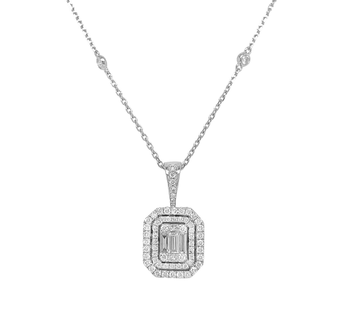 18kt white gold invisible set blue sapphire and micro prong set baguette and round brilliant diamond reversible pendant.