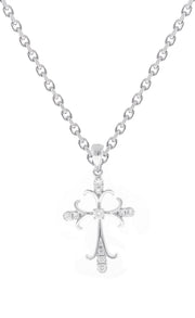 18kt white gold micro prong set round brilliant diamond cross pendant with 14kt white gold cable link chain.