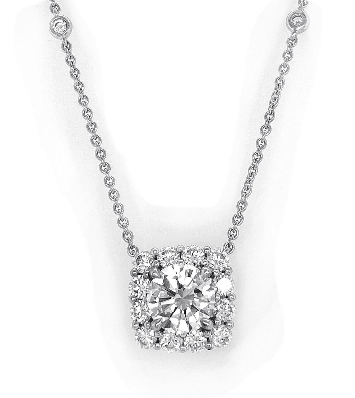 18kt white gold 4 prong set GIA Certified round brilliant diamond necklace with mutual prong set round brilliant diamond cushion halo.