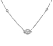 18kt white gold 2 prong set marquise diamond pendant with micro prong set round brilliant diamond halo.