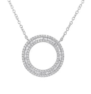 18kt white gold channel set baguette and micro prong set round brilliant diamond circle pendant.